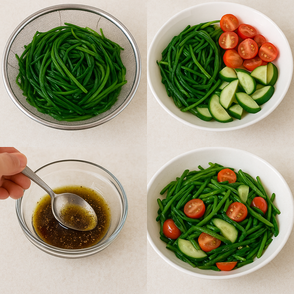 - 고구마순, 토마토, 오이를 볼에 담고 올리브오일, 발사믹 식초, 소금, 후추로 버무리면 끝!