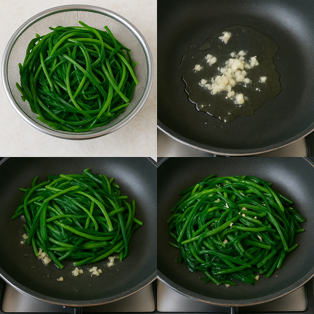 💡 TIP: 고구마순을 너무 오래 데치면 질겨지고 색도 탁해져요. 짧게 데치는 것이 포인트예요!