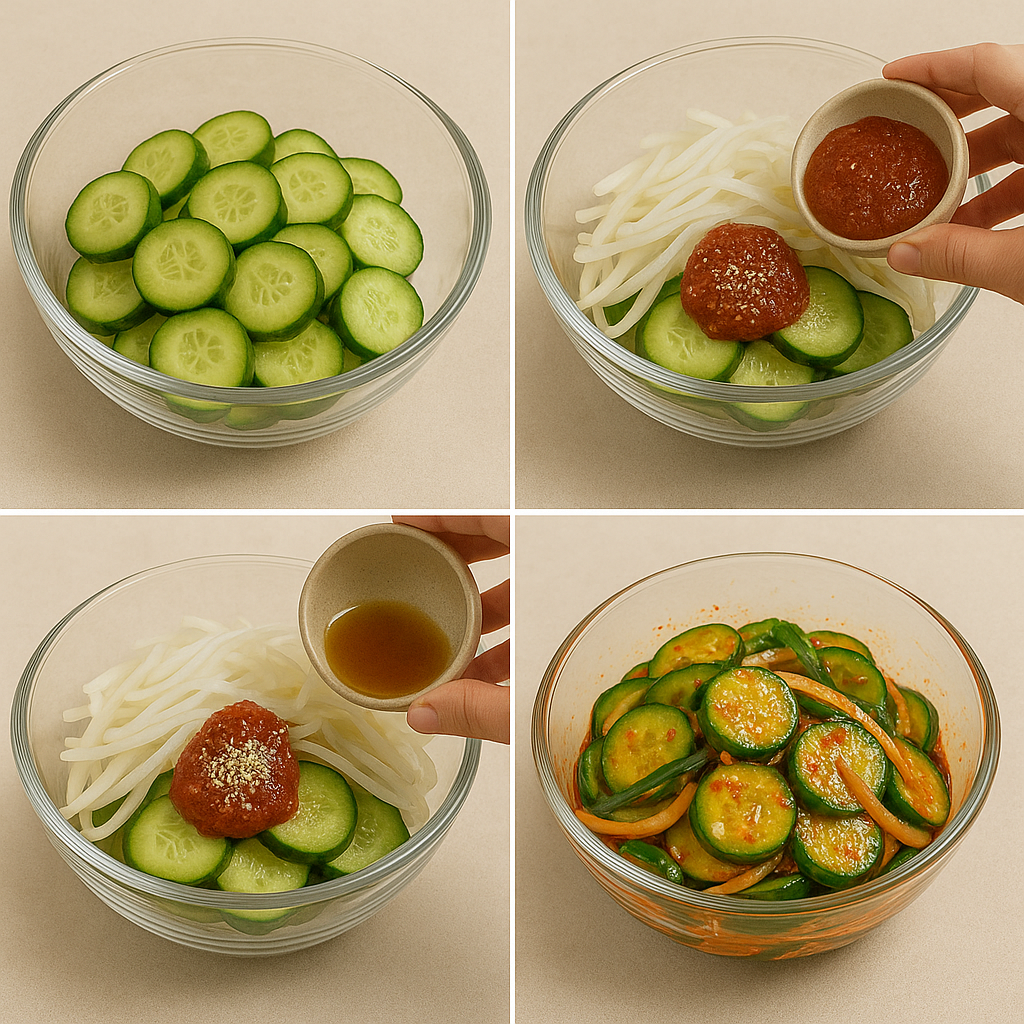 - 오이와 양념장을 30~40초 안에 살살 버무림