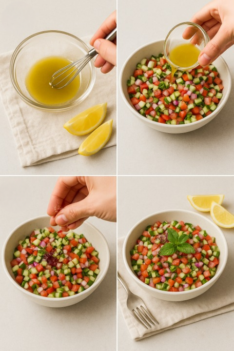 - 큰 볼에 오이·토마토·양파·허브를 담고 드레싱을 부어 살살 섞기.