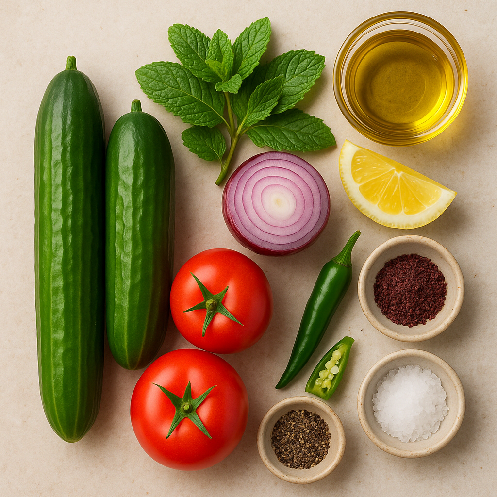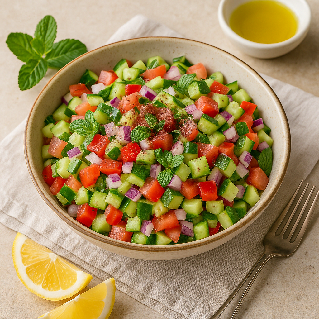 페르시아의 대표 생채 샐러드, 쉬라즈(Shirazi) 샐러드는 잘게 썬 오이·토마토·양파에 상큼한 레몬즙(혹은 라임)을 더한 초간단 건강 메뉴예요. 기름을 최소화해 가볍게 먹기 좋고, 여름철 수분·비타민 보충에도 딱 맞죠.
