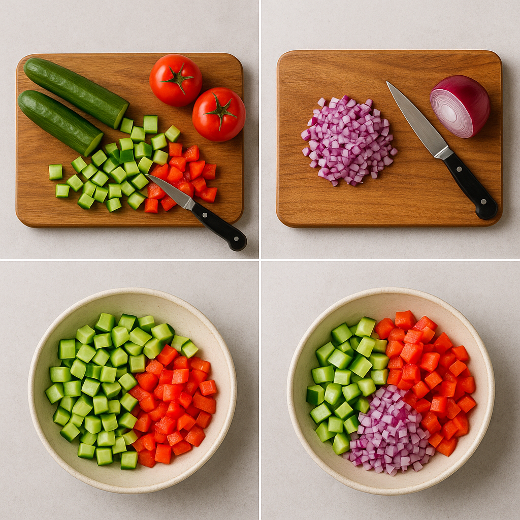- 오이·토마토·양파를 0.5cm 내외 깍둑으로 아주 잘게 썹니다. (작게 썰수록 식감이 균일하고 ‘정통’ 느낌 업!)