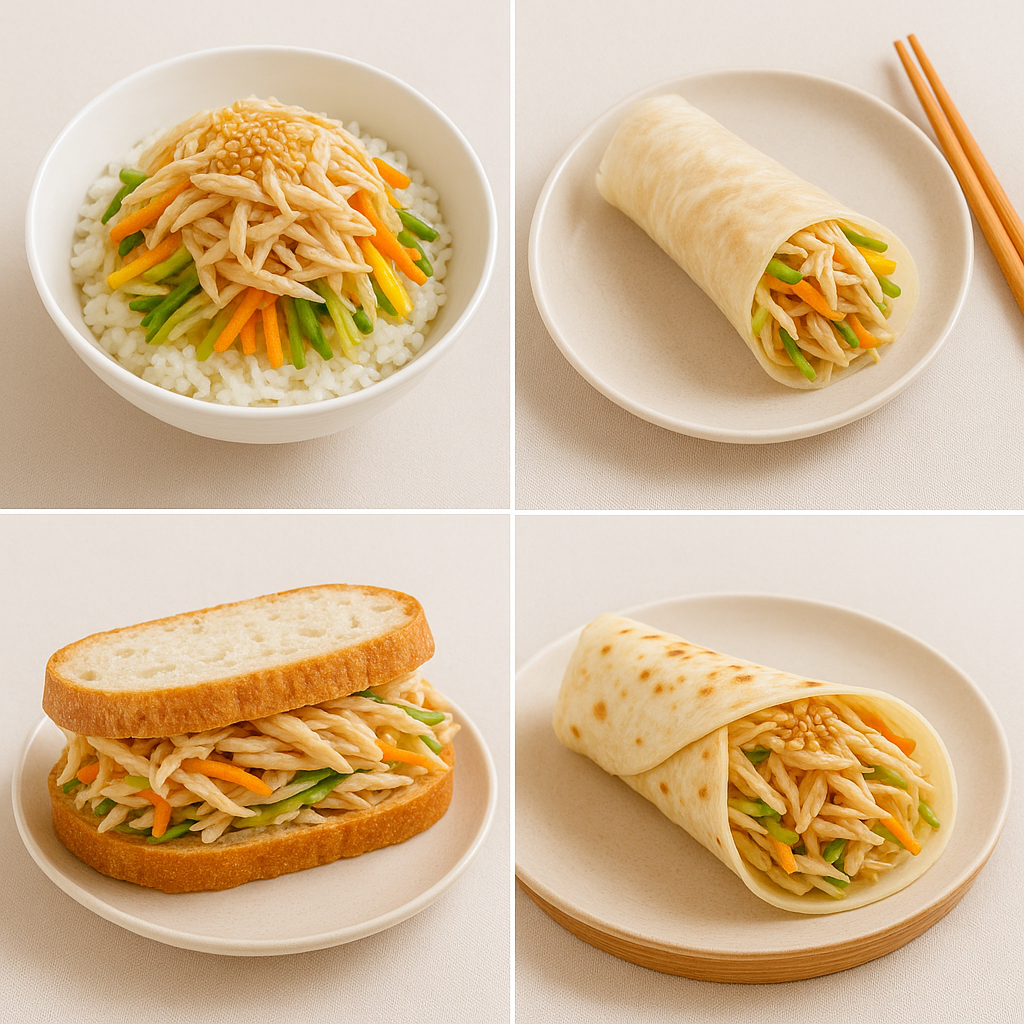 ‘닭고기 냉채’는 삶은 닭가슴살과 채소를 겨자나 유자 베이스의 소스로 무쳐서 차갑게 먹는 한식 스타일의 냉요리입니다.