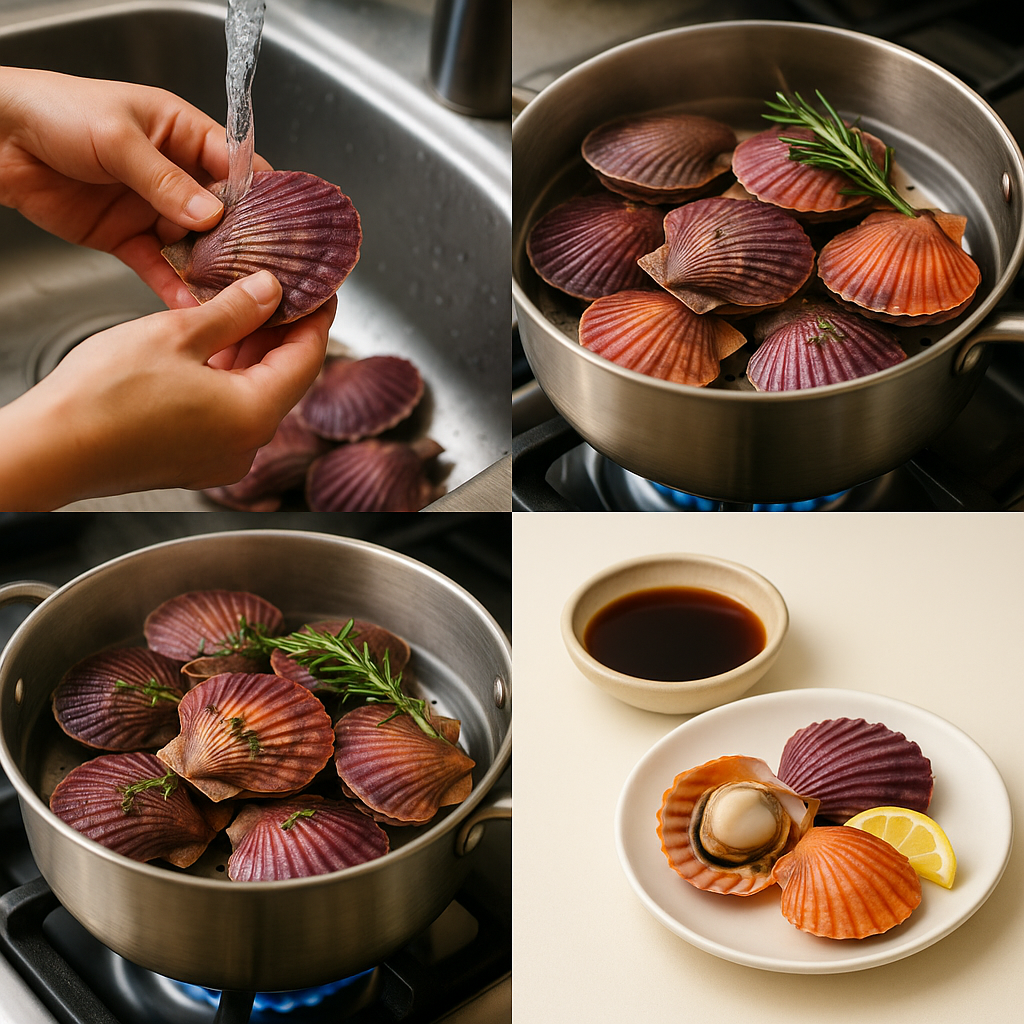 - 가리비를 깨끗이 손질한 뒤, 끓는 물에 1분간 데치거나 팬에 살짝 구워 준비합니다.
