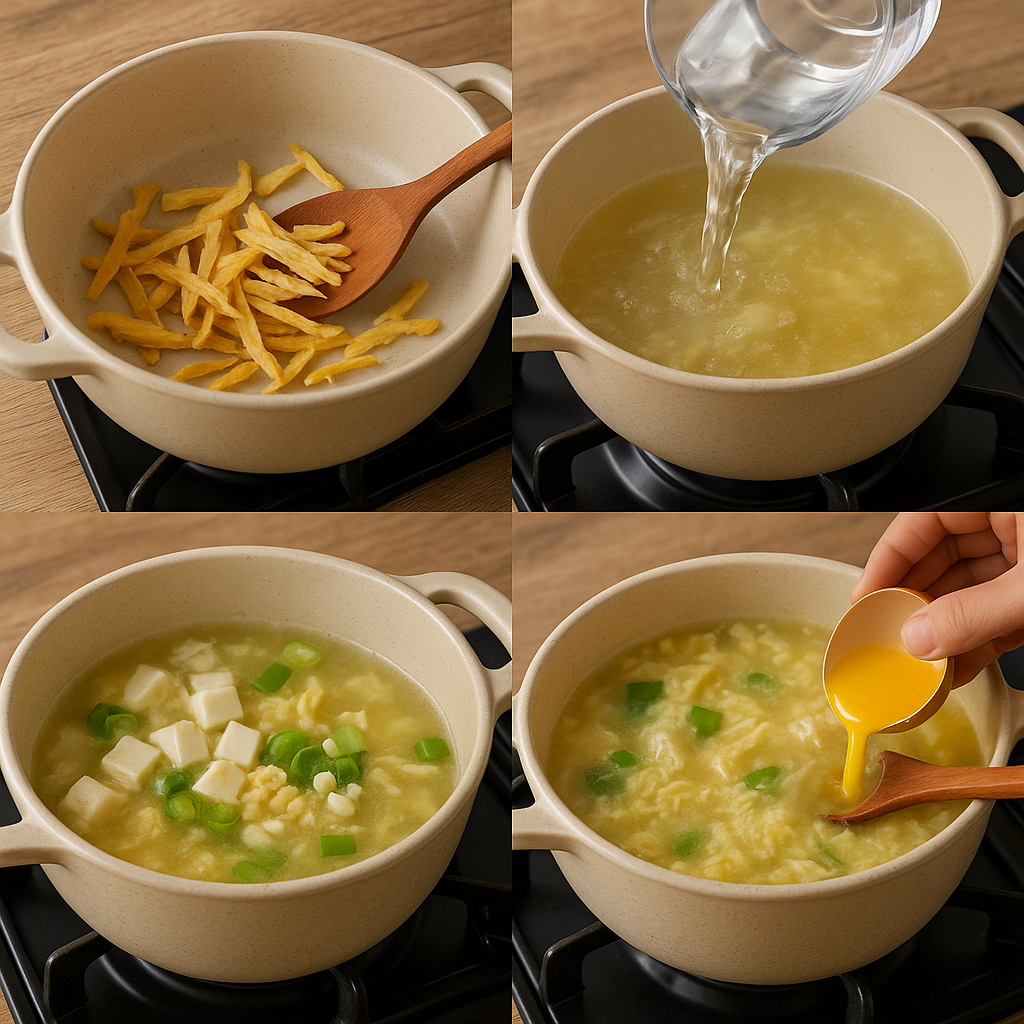👉 국간장, 다진 마늘, 두부, 대파를 넣고 5~7분 정도 은근하게 끓입니다.