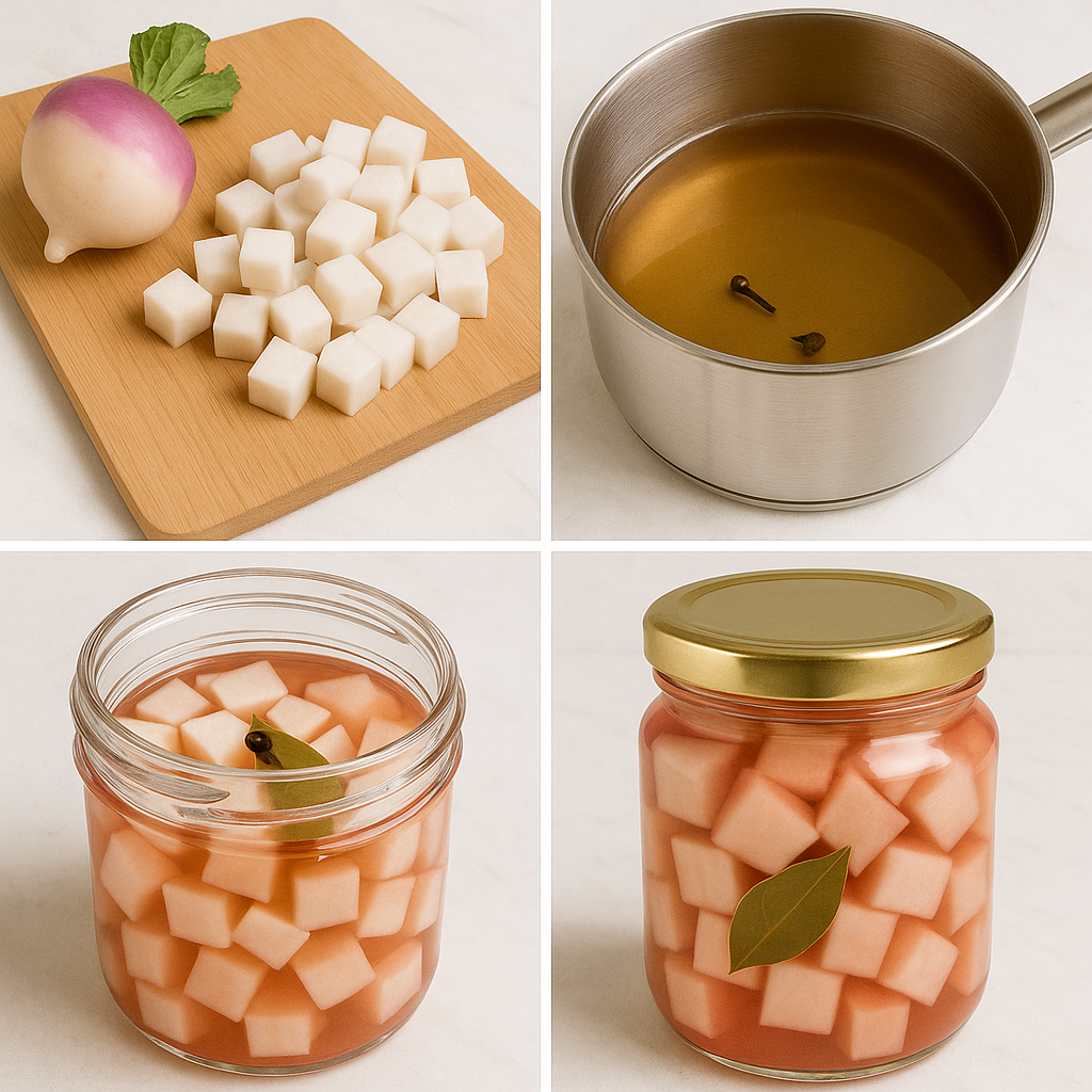 - 순무를 1cm 큐브로 썬 후 끓인 피클 액에 담그기
