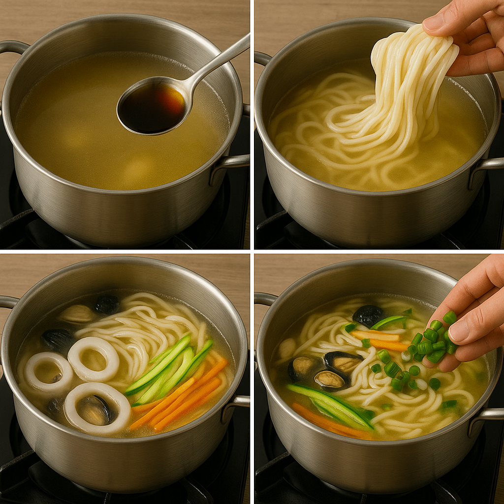 🔹 4단계: 면과 재료 넣고 끓이기