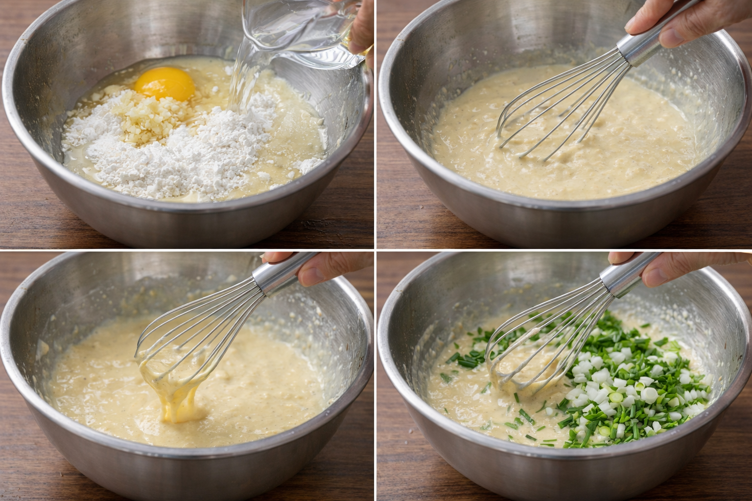 - 볼에 계란, 부침가루, 물, 다진 마늘, 소금을 넣고 잘 섞습니다.