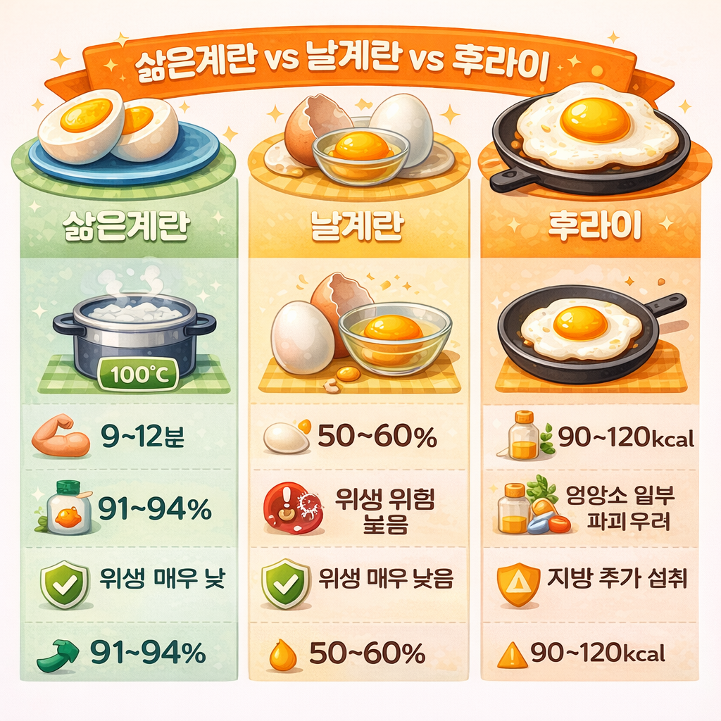 📊 2. 삶은계란 vs 날계란 vs 후라이 – 영양 비교 총정리
