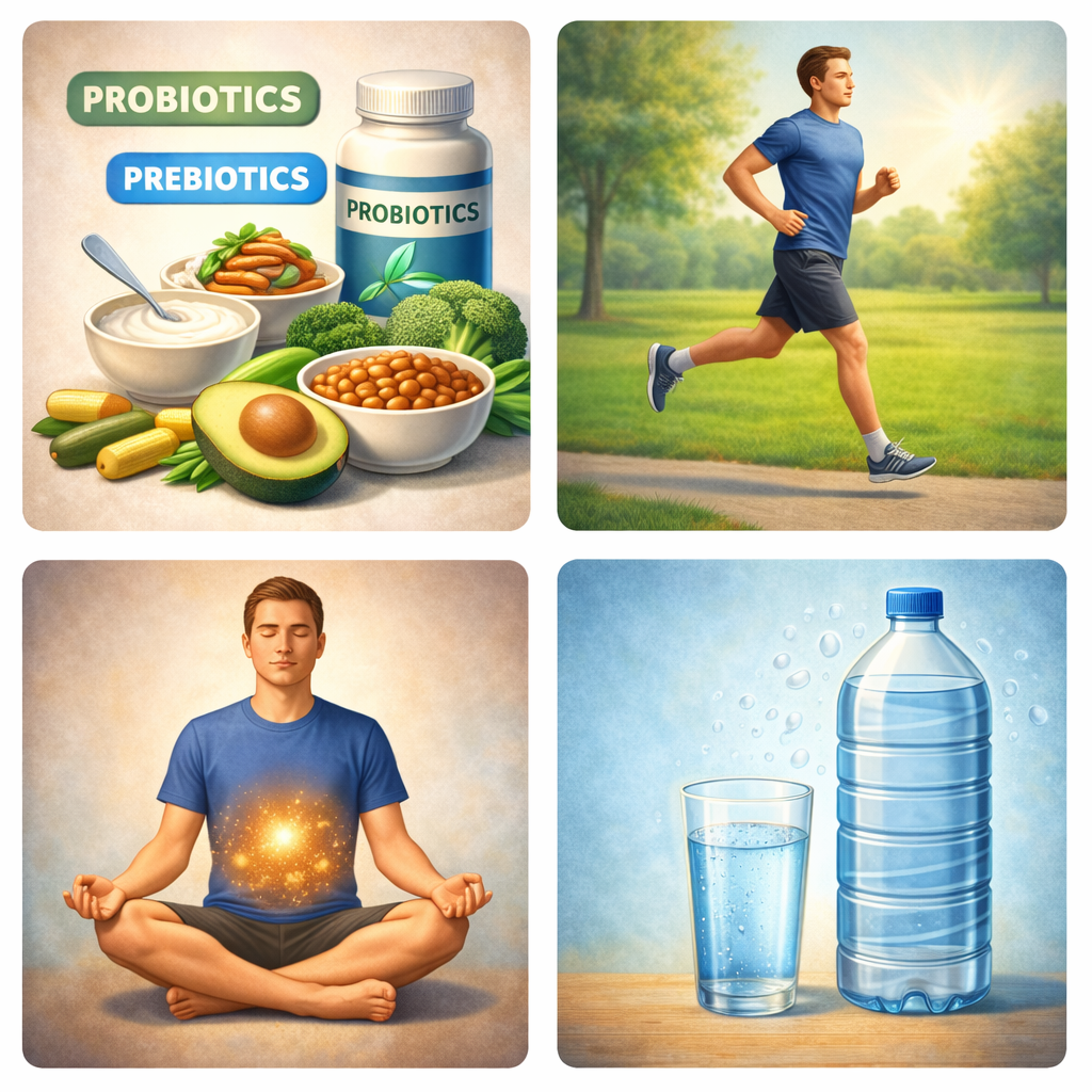 → 유산균, 김치, 요구르트, 청국장, 식이섬유가 풍부한 식품 섭취 - 🚶 규칙적인 운동 → 장운동 촉진