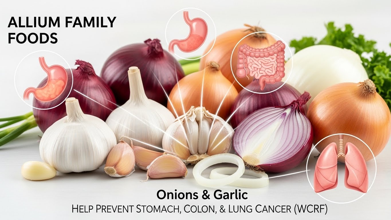 세계 암연구기금(WCRF)에 따르면, 양파와 마늘 같은 ‘알리움(Allyl)’ 계열 식품은 위암, 대장암, 폐암 예방에 기여할 수 있다고 보고된 바 있습니다.