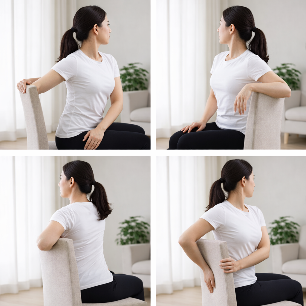 - 상체를 오른쪽으로 천천히 비틀고, 손으로 등받이를 잡아줍니다.