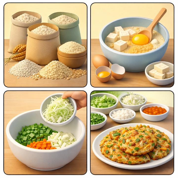 - 🍚 쌀가루: 글루텐 부담↓(다만 흰쌀가루만 쓰면 혈당 주의)