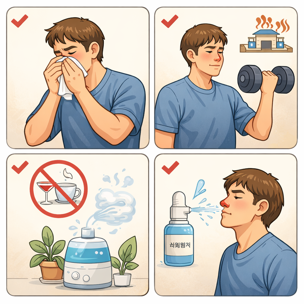 - 🧴 코 안이 건조하면 생리식염수 스프레이(무리하지 않게)