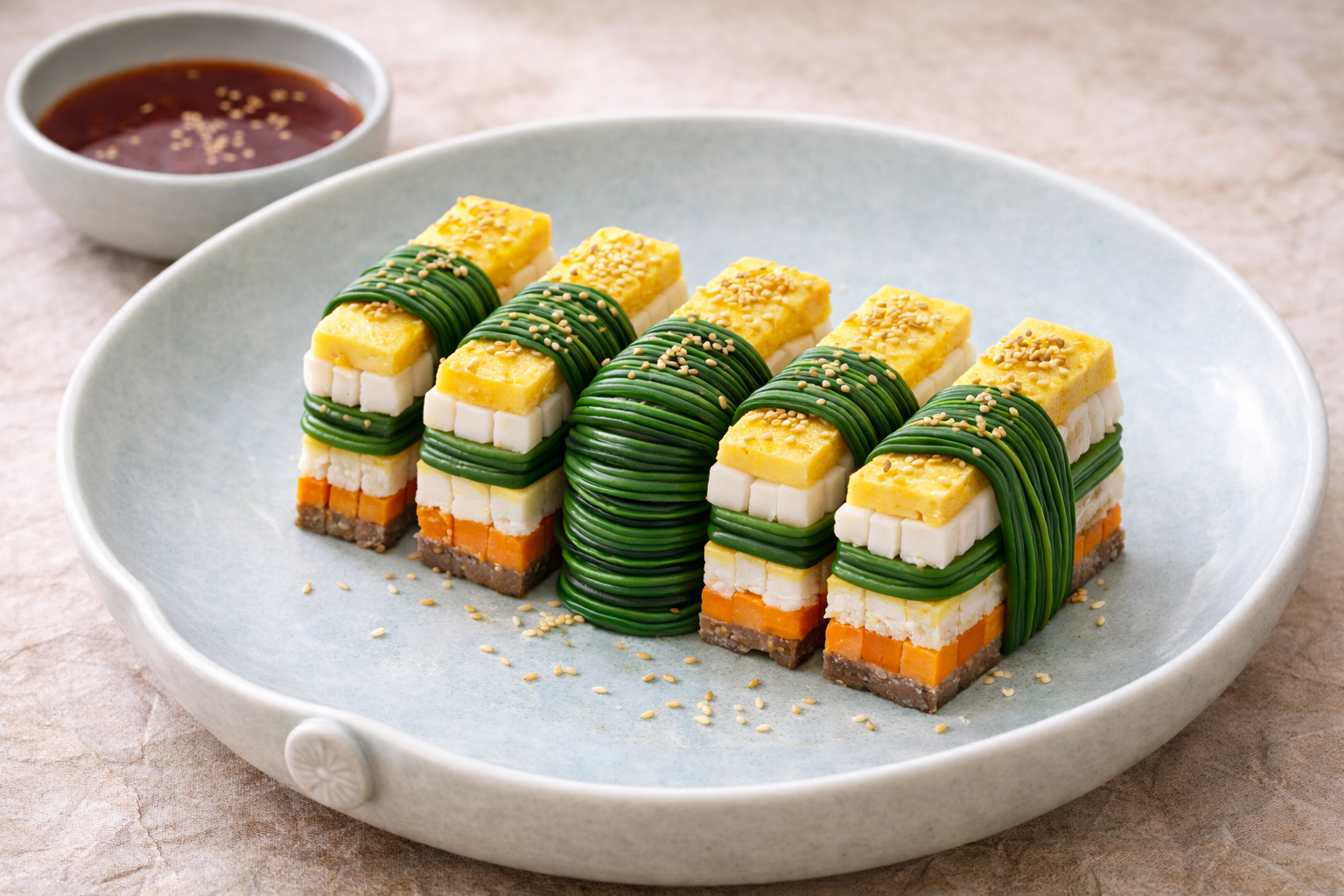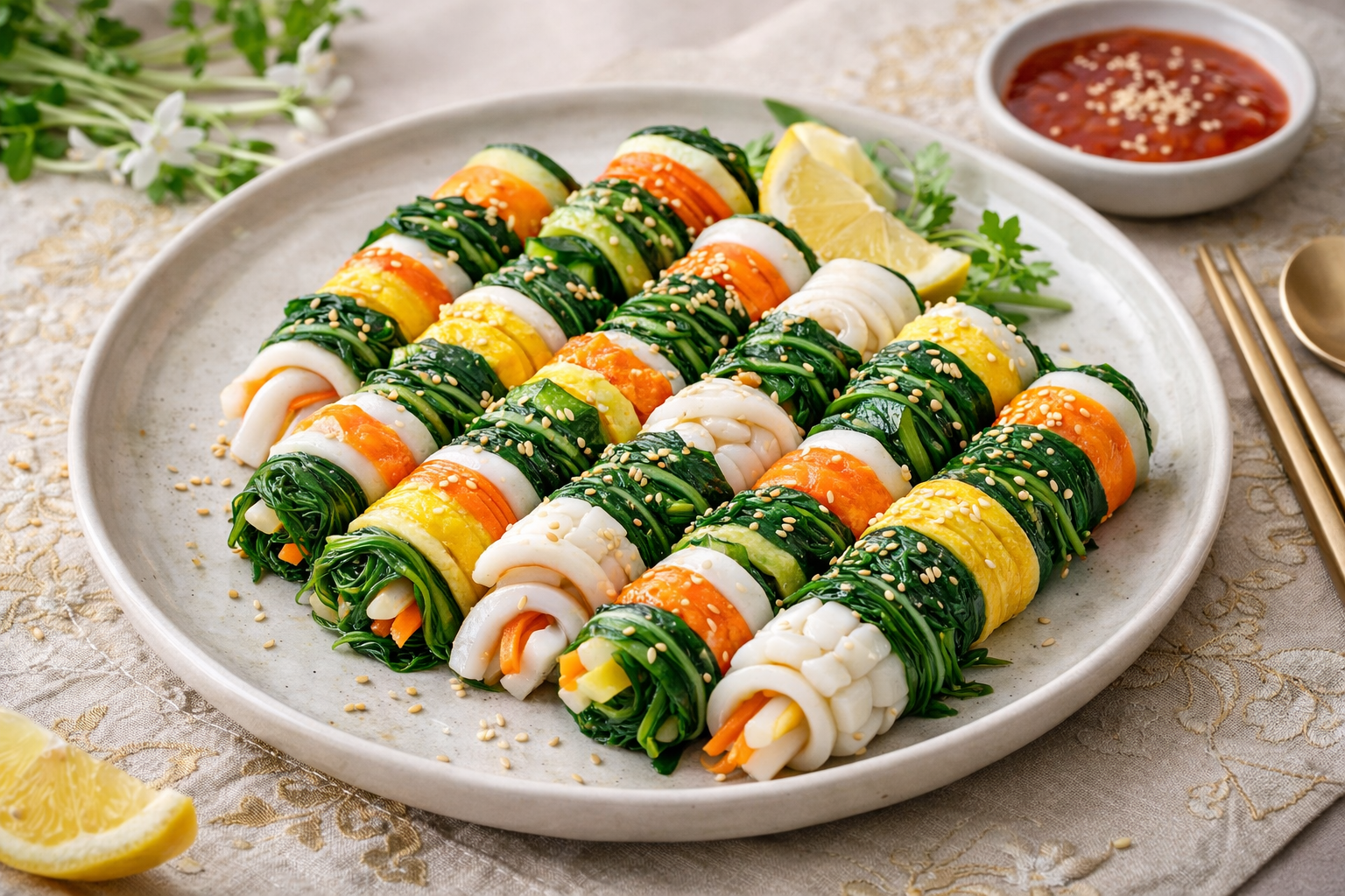 - 오징어/지단/오이는 색 순서로 둘러 세팅 (초록-흰-노랑-주황) 🌈